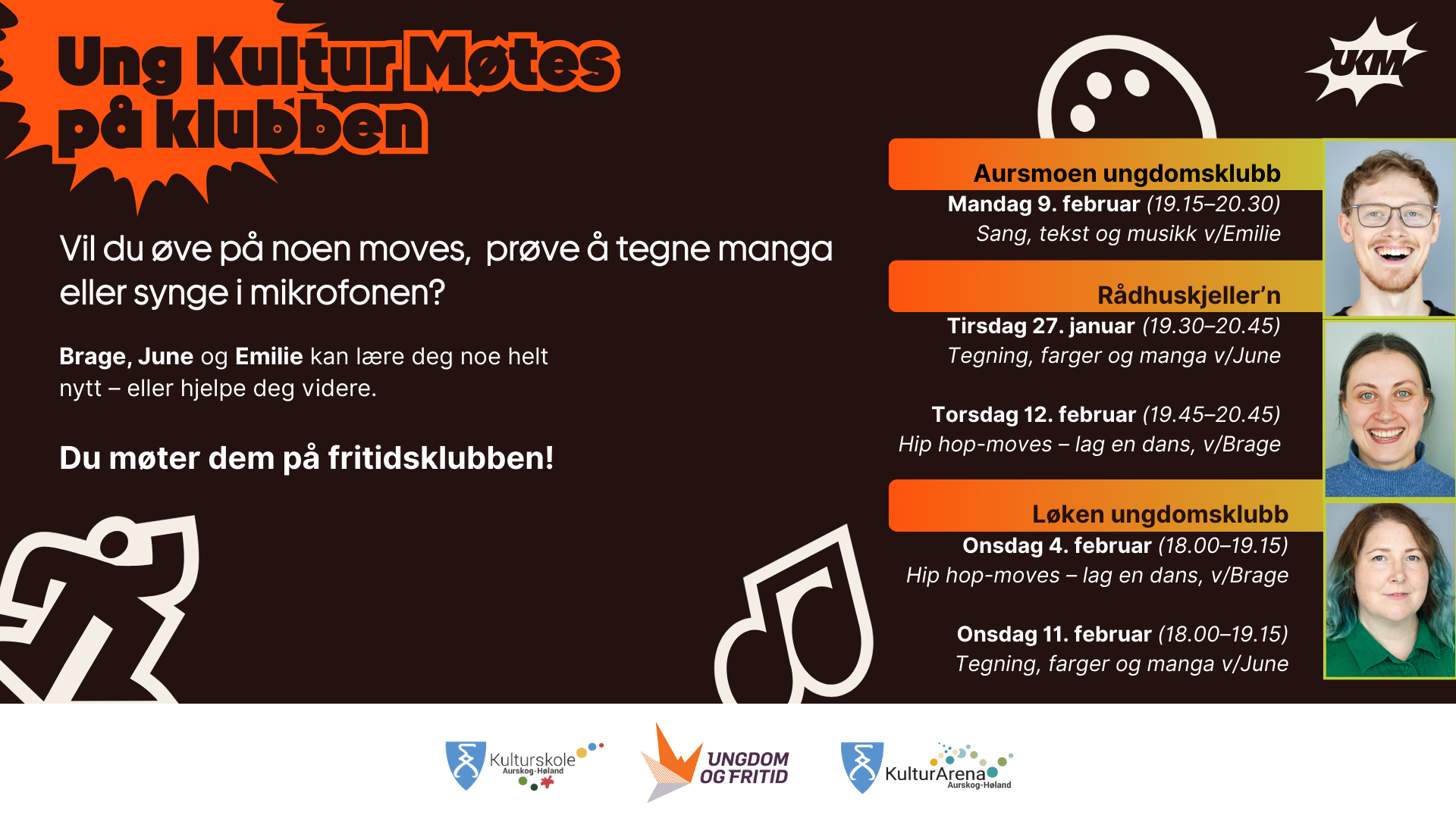 Vi har tilbud innen musikk, dans, teater og visuell kunst. Vår målgruppe er barn og unge fra 0 til 25 år, men voksne kan få plass ved ledig kapasitet.